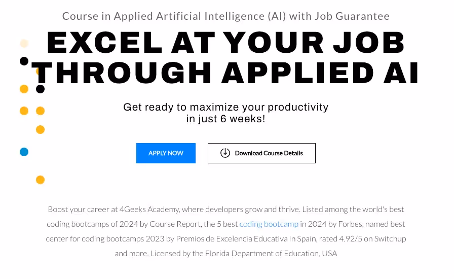 TripleTen's AI Automation program is a perfect place to start. This is one of the best AI bootcamps for beginners because it keeps things simple and focuses on practical ideas without heavy coding. You'll get instruction from experts who know what they're talking about and know how to tackle any questions or issues you might have as you gain new, in-demand skills. Applied Artificial Intelligence by 4Geeks Academy is likewise a good choice for people new to tech who want an introduction to using generative AI. In either case, no coding skills are needed. Just bring your curiosity and eagerness to learn.
