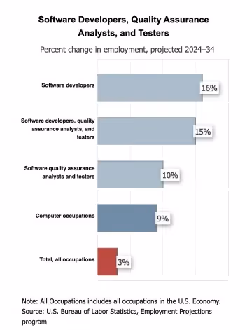 Software engineering is one of the most in-demand careers in the country right now—and the numbers back it up. According to the U.S. Bureau of Labor Statistics, employment of software developers is predicted to grow 16% from 2024 to 2034, roughly five times faster than the average for all occupations. About 129,200 openings are expected each year over the decade, and the median annual salary for software developers reached $133,080 in May 2024.