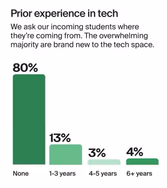 There's no admissions test or an assumed baseline, making this software engineering bootcamp ideal for career switchers moving away from healthcare, education, finance, or hospitality. Since 2020, 2,600+ graduates have completed TripleTen’s tech bootcamps and gone on to land roles in tech, with 80% having no previous technical experience.