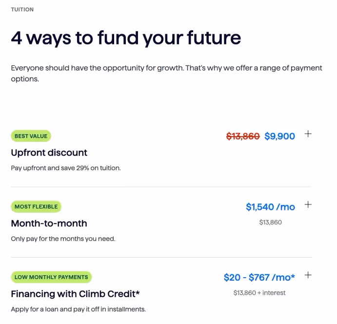 - Tuition: Up to $16,450 full-time; financing through Climb Credit at 0% interest available; veterans can use their GI Bill® benefit in select U.S. markets.