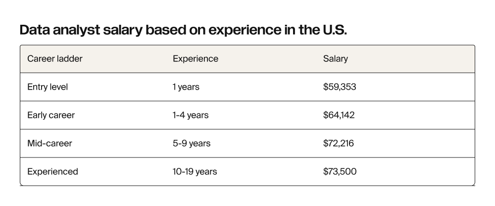 Senior level data analysts (10–19 years of experience) can have an average salary of $73.5 K—and that’s just the starting point. More income typically brings more responsibilities: seniors need to master more complex skills, carry out management tasks, and oversee a company’s overall data strategy.