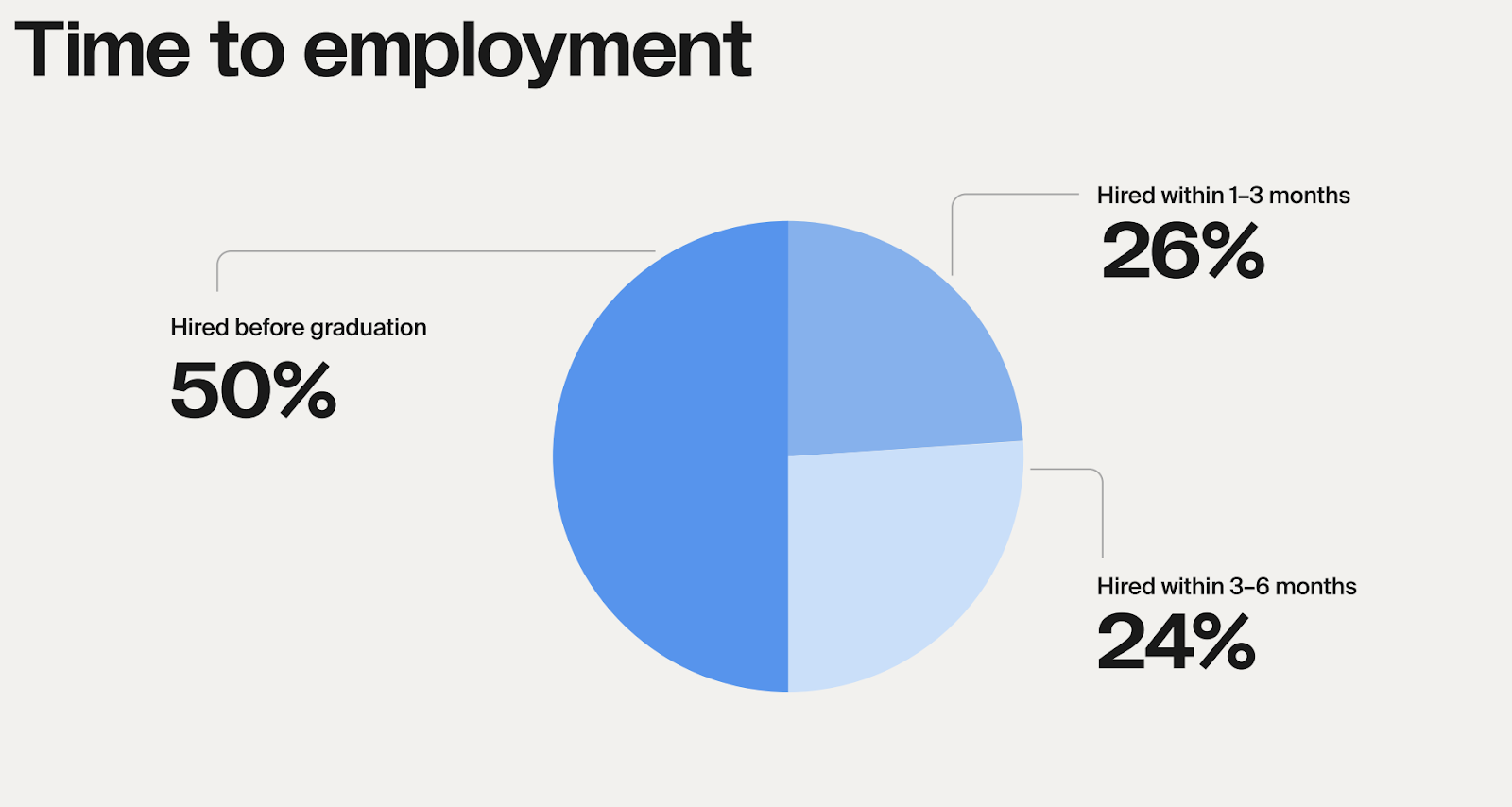What are your odds of finding work in your new field? In TripleTen’s Outcomes Report, data shows that 50% of successful grads land jobs before even graduating. In addition, 24% of these grads land jobs within 1-3 months of graduation, and 26% land jobs within 4-6 months of graduation.