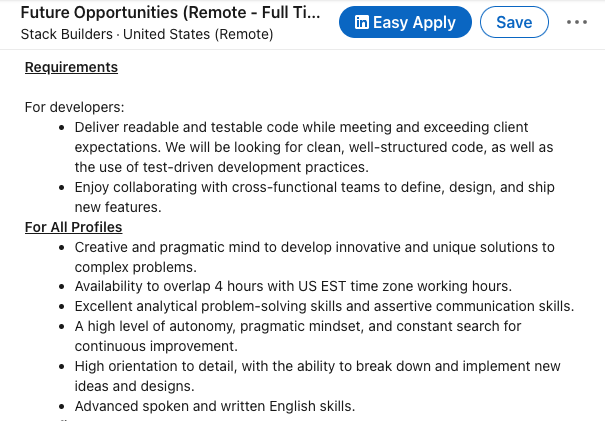 Different tech professions require a diverse set of skills. Senior positions are filled with candidates with impressive portfolios matching the company’s profile, while entry and mid-level jobs are more flexible. The requirements also get higher and more specific as the organization grows in size.