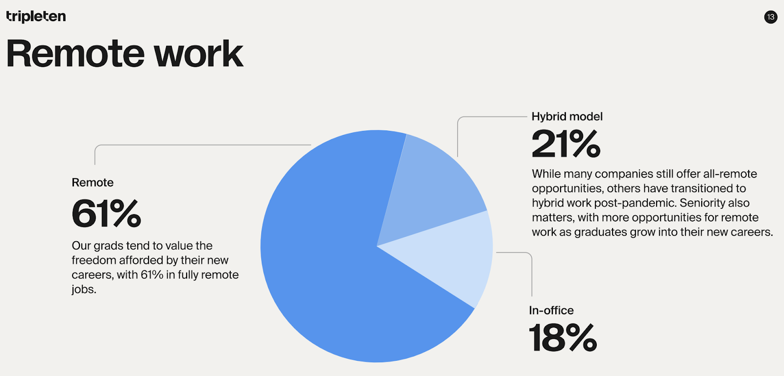 AC’s story isn’t a fluke, either. If we return to our Outcomes Report, we can see that the absolute majority of our grads land flexible work arrangements in their new careers. In total, 82% spend at least part of their week working remotely, and 61% don’t have to come into an office whatsoever.