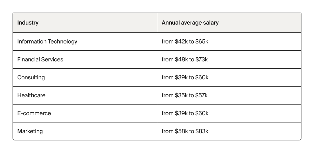 Finance: This industry heavily relies on data analysis for decision-making, risk assessment, and market research. Banks, investment firms, and insurance companies offer an average salary of $48,000 to $73,000.