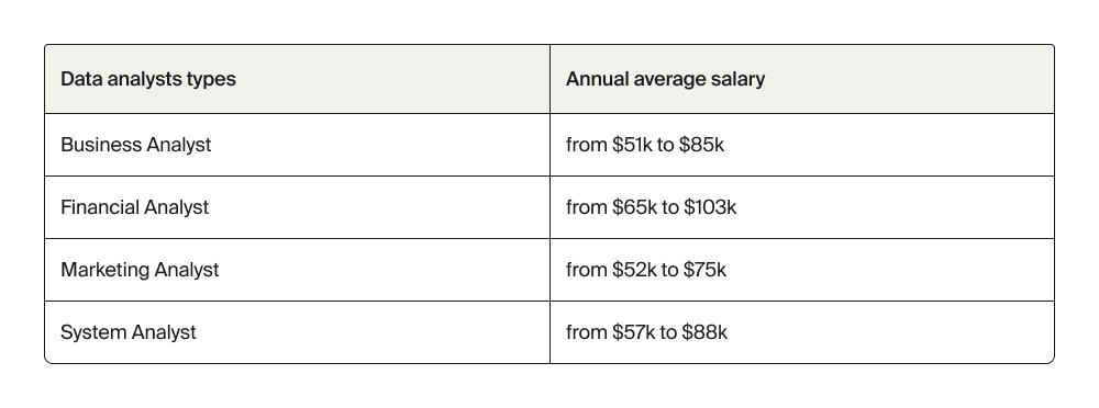 According to Glassdoor, the average annual salary for a beginner specialist, regardless of the industry, is $48,362. However, the most commonly offered figure ranges from $39,000 to $60,000. You can find more detailed information about the journey of a beginner data analyst in this article. Even a beginner specialist will make enough money to cover the costs of the bootcamp in just a few months.