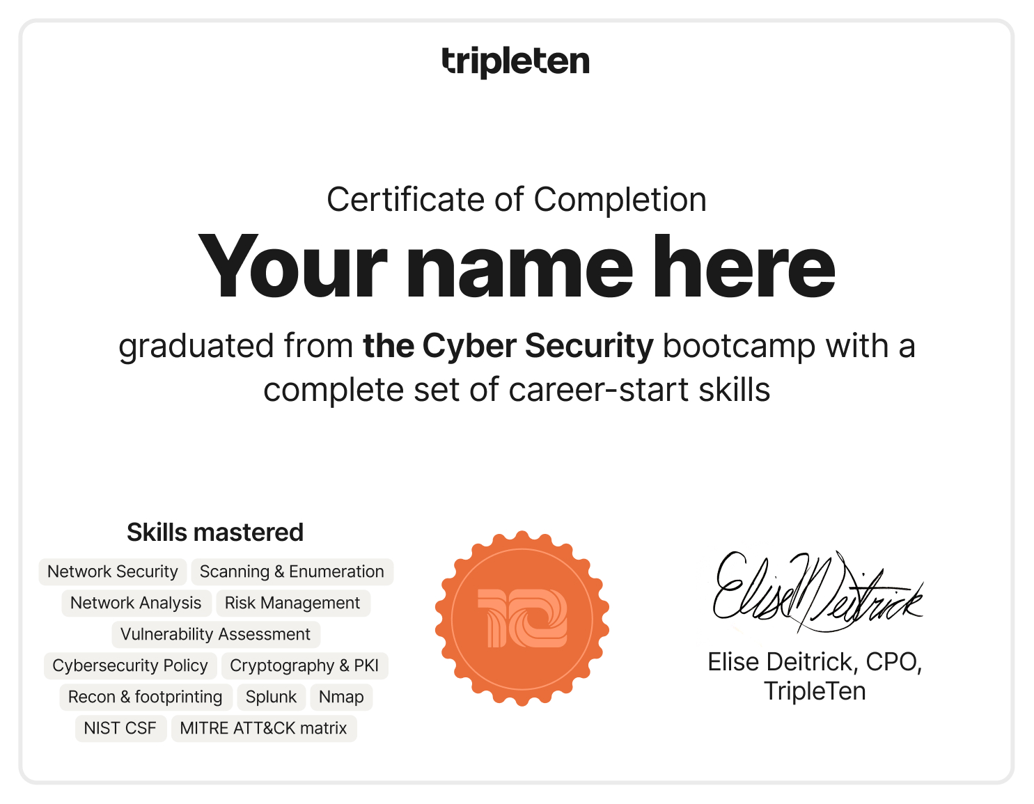 The TripleTen Cyber Security Bootcamp gives you hands-on training on the latest security technologies and methodologies. You’ll learn hard skills like malware and virus threats, network security controls, cryptography and vulnerability testing methodologies, as well as how to manage risk, develop security procedures and plan for disaster recovery. Additionally, you’ll also acquire soft skills, including risk management, critical thinking and communication—critically important when having to explain technical concepts to non-technical individuals.