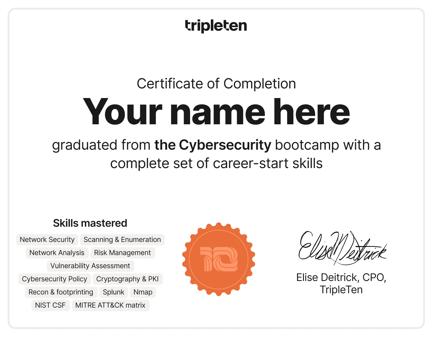 You’ll graduate from your cybersecurity bootcamp with a completion certificate from TripleTen, as well as the industry-recognized CompTIA Security+ certification.